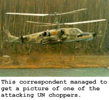 Oregonians Capture UN Train, Shoot Down UN Helicopters!Reported August 10, 1997 This morning I had the stark pleasure of being able to report to HQ an almost impossible event. While on board the current hijacked former UN train, now headed East, captained by Nivek and his blood thirsty crew of former cowboys, potato processing mechanics, a few good farmers, and two ex-UN "dansin-gihrlz", I witnessed the downing of not just one, but two UN Russian manufactured attack helicopters. As the morning started to rise, coffee was being made in the extant luxury of the UN Commanders "Liberty" car, fresh donuts were being distributed to the former Law Enforcement officers (first) and then on to the rest of the Krew. Ever so quickly one of the girls spotted movement in the still dark West approach and snap shot her SA-7, which ruined the "facilities" of the "Liberty". As the alarm sounded, the anti-air asset battery now placed one the rear flatcar sprang into action. Unfortunately, the lack of discipline and fire control made this incursion by the UN fliers a nightmare. With Nivek on top of the "Liberty' shooting a multi-barreled machine gun, and most of the hand held anti-air missals up, there wasn't a chance in Hell for those choopers to excape. After incident recap shows that thirty-seven hand held, sixteen flatcar mounted, and about 10,000 rounds of the UN 12.7mm m/g ammo were used in this victory over the OPFOR.